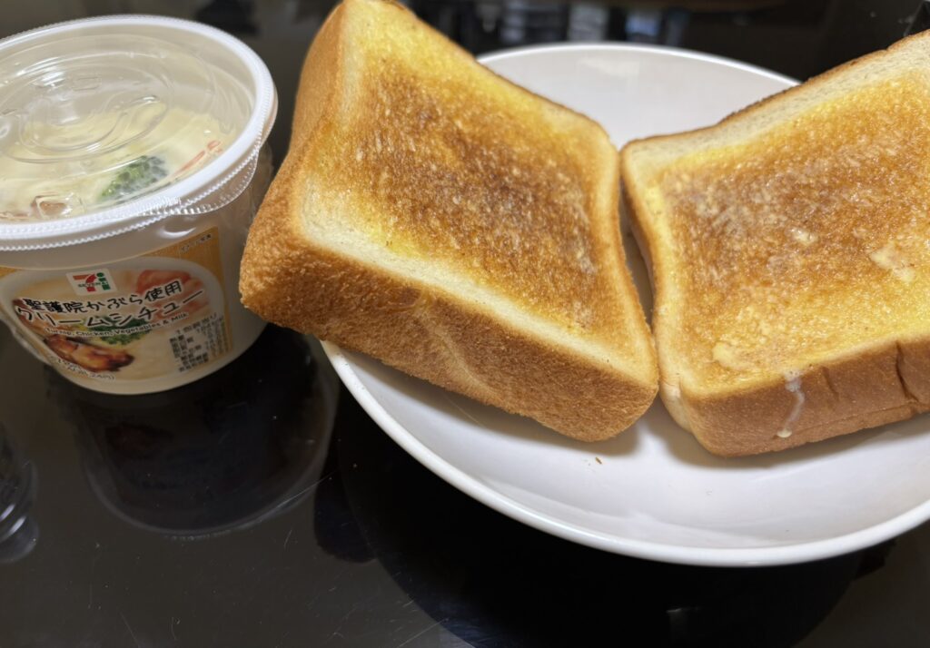 セブンイレブンのクリームシチューと食パン2枚です!